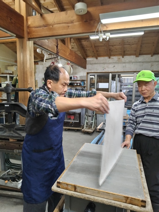続いて竹紙漉きの工程を説明し、竹紙漉きを開始しました。終了後には青い孟宗竹からこのような竹紙が出来ることを体験出来たことに感激してました。体験終了後も今回の竹紙漉きについての各工程についての質問がありました。竹林の管理についても意見交換を行いました。